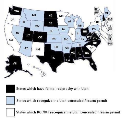 2. Recognition: An informal policy of recognizing another states concealed firearm permit by virtue of it’s validity in the state of issue. States that recognize Utah’s concealed firearm permit are as follows: